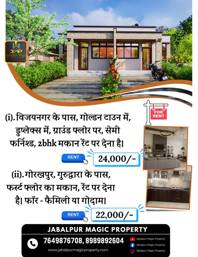 (i). विजयनगर के पास गोल्डन टाउन में डुप्लेक्स के ग्राउंड फ्लोर पर सेमी फर्निश्ड 2BHK मकान रेंट पर उपलब्ध है, जिसका किराया 24,000/- प्रति माह है।